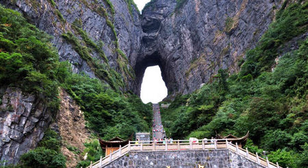 La montaña Tianmen, cuyo nombre significa "puerta del cielo", posee un agujero natural de 131,5 metros de altura y 30 metros de ancho situado a 1.524 metros sobre el nivel del mar.