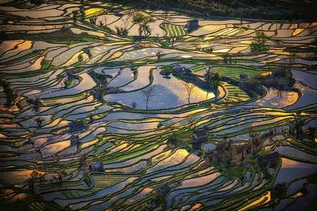 terrazas que se escalonan desde las laderas escarpadas de los Montes Ailao hasta las orillas del río Yuan. A lo largo de