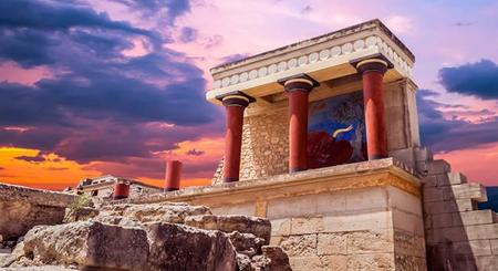 El Palacio de Knosos, cuyo origen se remonta al año 2000 A.C., reconstruído en 1900, ha sido referente político, religioso y económico de la legendaria dinastía minoica. Laberíntico palacio con estupendas pinturas murales, baños, columnatas y la villa de Ariadna. El palacio se identificó como el Laberinto de Creta, el cual, según la mitología, es el laberinto en el que Dédalo encerró al terrible Minotauro.