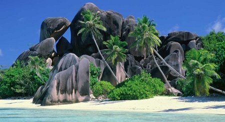 peculiares rocas graníticas que se funden con los cocoteros y su fastuosa arena blanca.