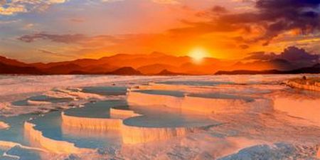 paisaje de blancas piscinas naturales con petrificadas cascadas de estalactitas gigantes.